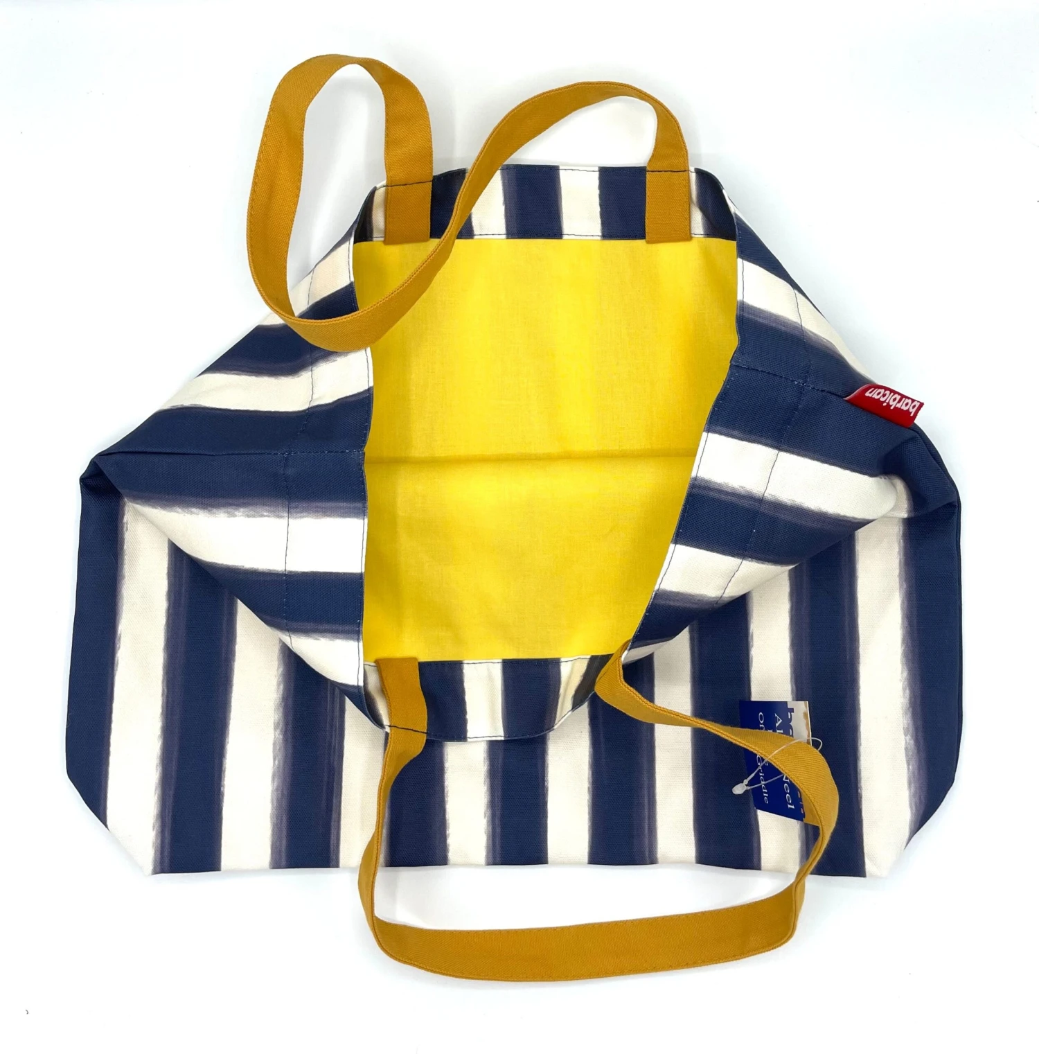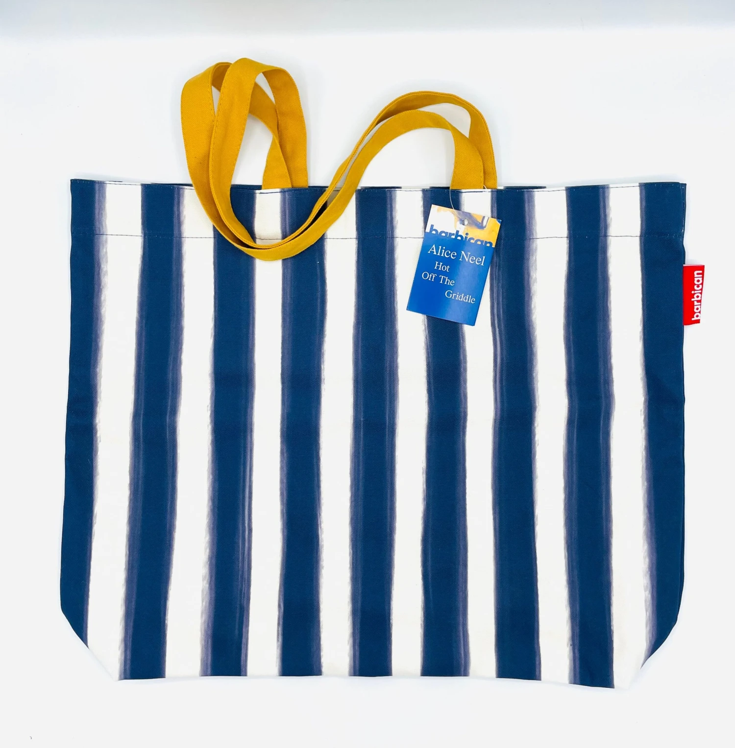 Material: 280gsm heavyweight natural cotton. Custom printed mustard yellow handles and contrast 100% cotton yellow lining. Bespoke red Barbican woven label sewn into the outside side seam.Â