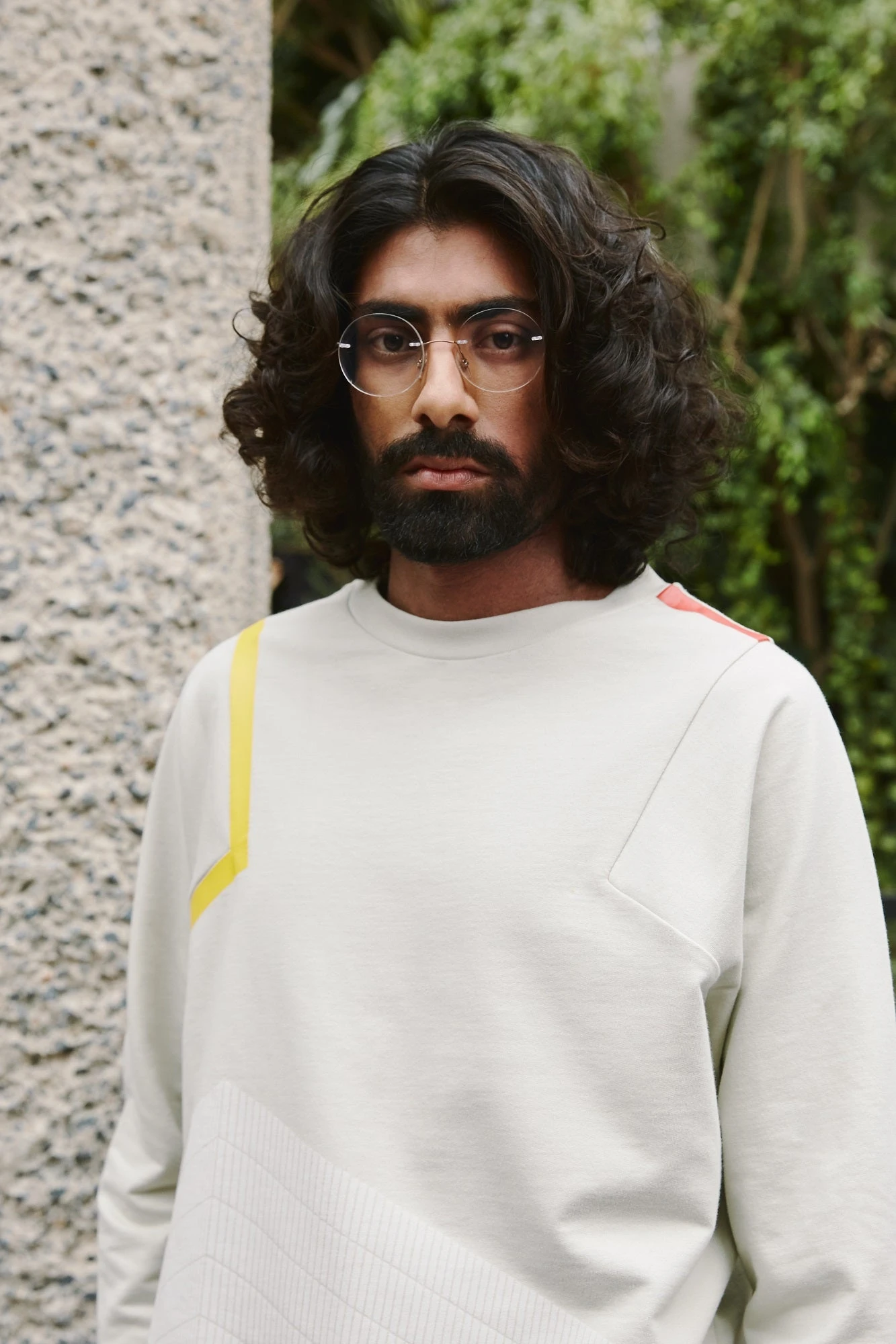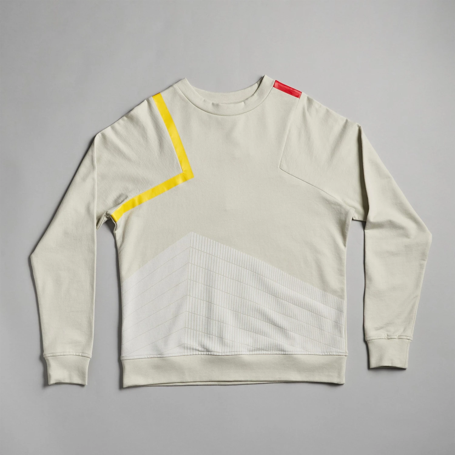 The sweater features the iconic yellow line of the Barbican on the shoulder, with the front print using the tile pattern found in the Barbican’s facade – set in subtle white.