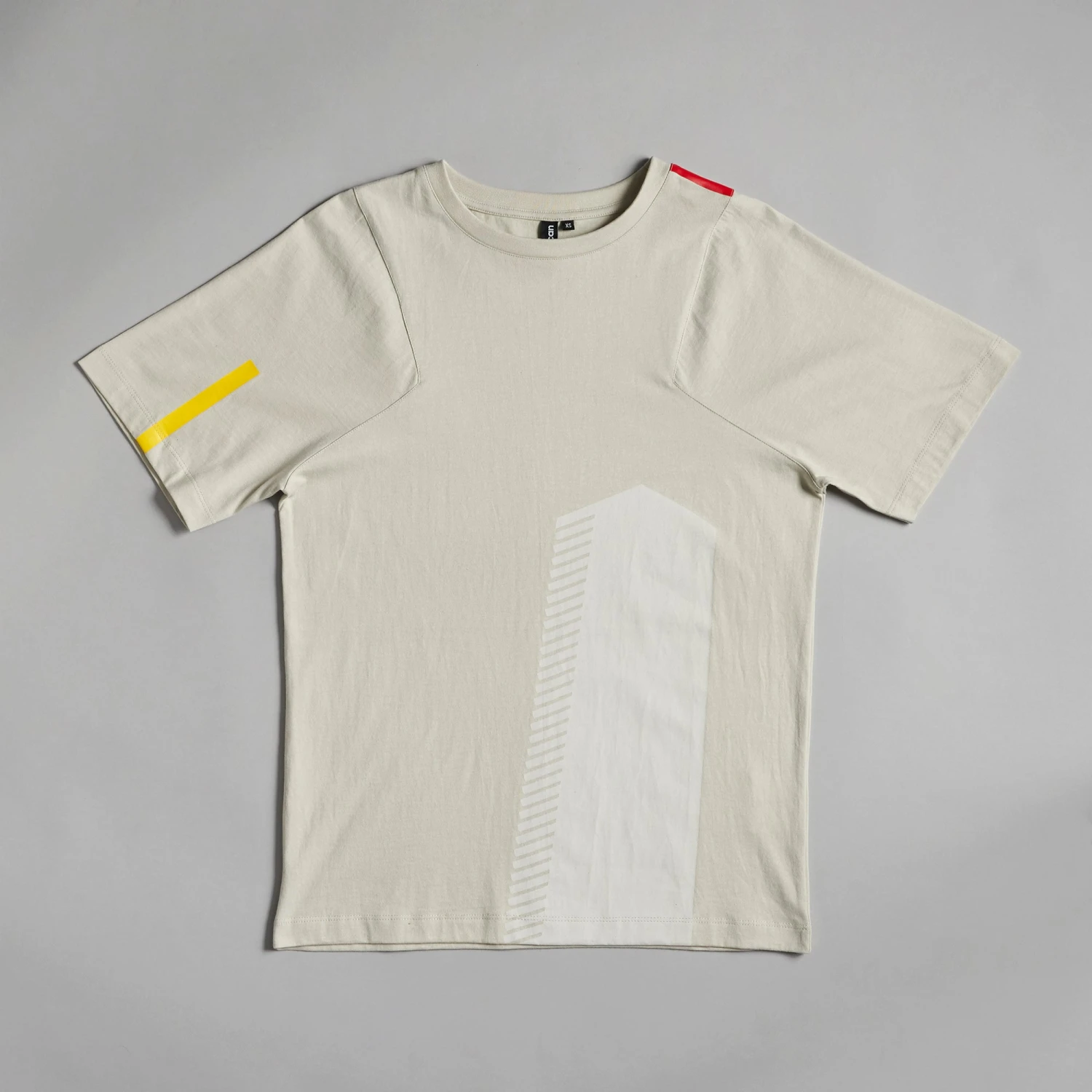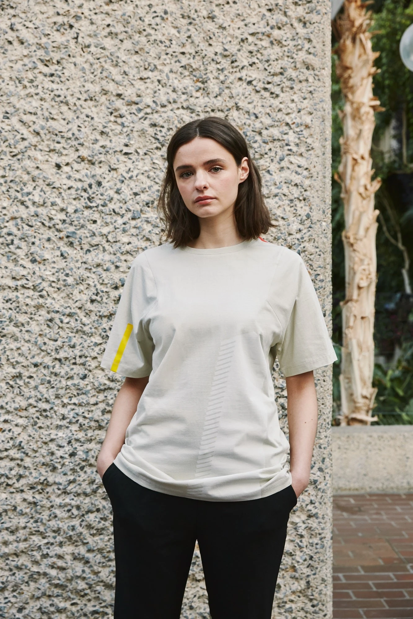 The t-shirt features a bespoke brutalist sleeve cut, a subtle nod to the legacy of Bauhaus modernism. Beige grey inspired by the estate’s concrete is foregrounded by the towers in print.