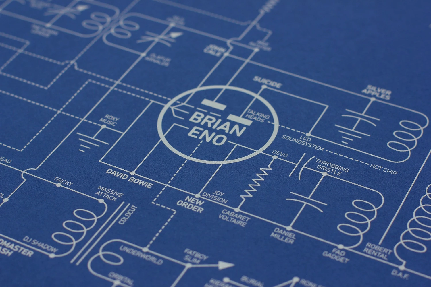 Print featuring the history of electronic music mapped out to the circuit board of a theremin, which is widely regarded as one of the first electronic musical instruments.