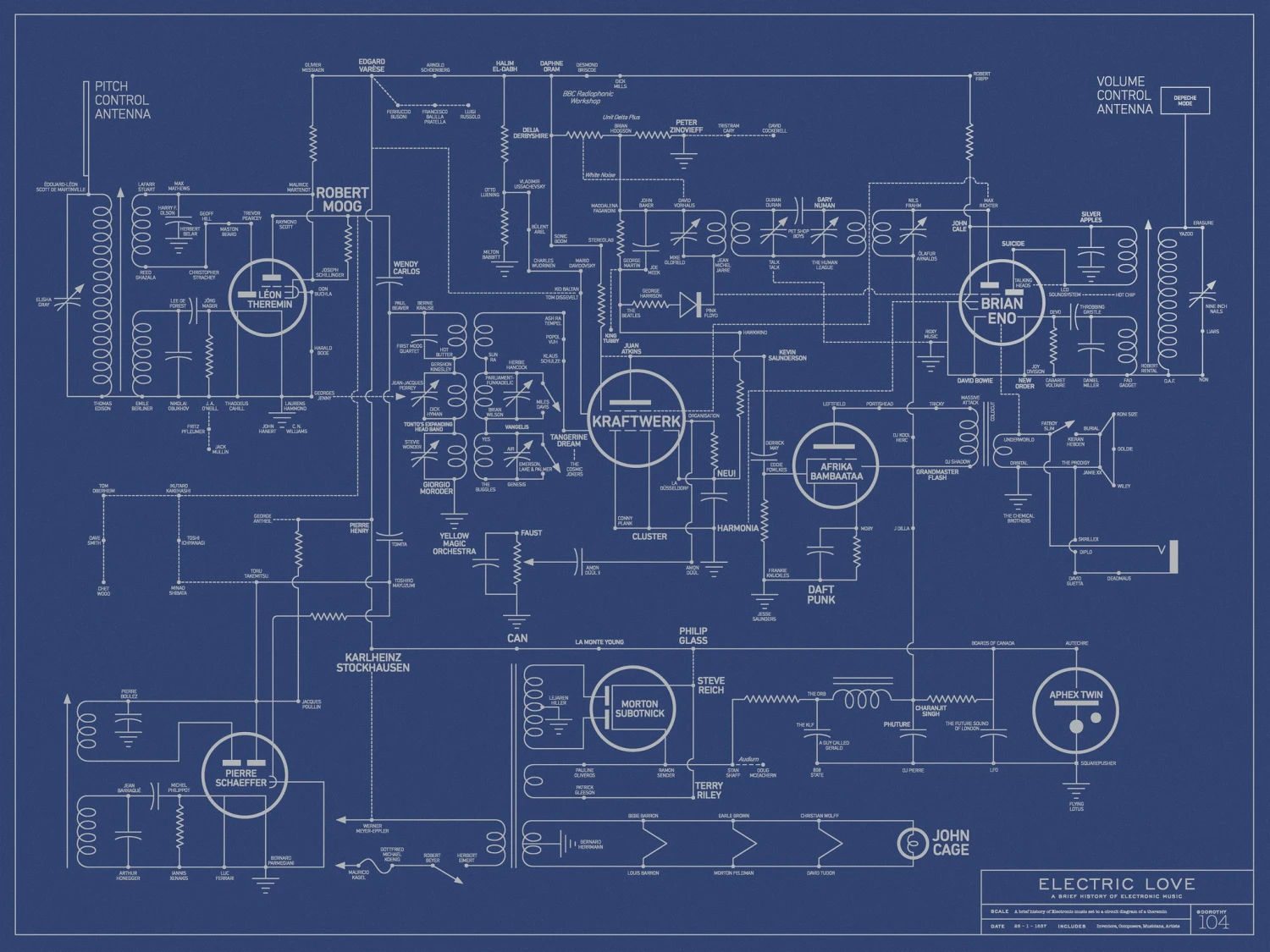 The Electric Love Blueprint by Dorothy celebrates over 200 inventors, innovators, artists, composers and musicians who have been pivotal to the evolution of electronic music from the invention of the earliest known sound recording device in 1857 to the present day. Key pioneers featured include Léon Theremin, Bob Moog, Karlheinz Stockhausen, John Cage, Brian Eno, Kraftwerk and Aphex Twin.Â