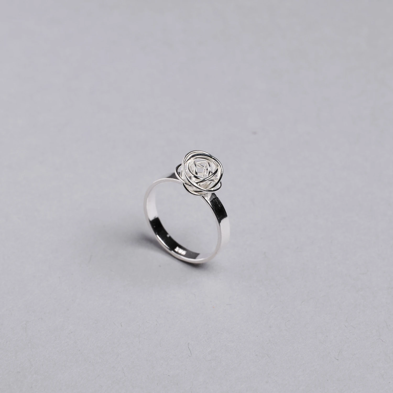 This handmade silver Nest ring by Otis Jaxon is created by fashioning a sterling silver wire wrapped in a seemingly haphazard fashion into a tiny, delicate silver nest. With the look of an abstract vintage rose, this really is a classic gift idea with a modern twist.