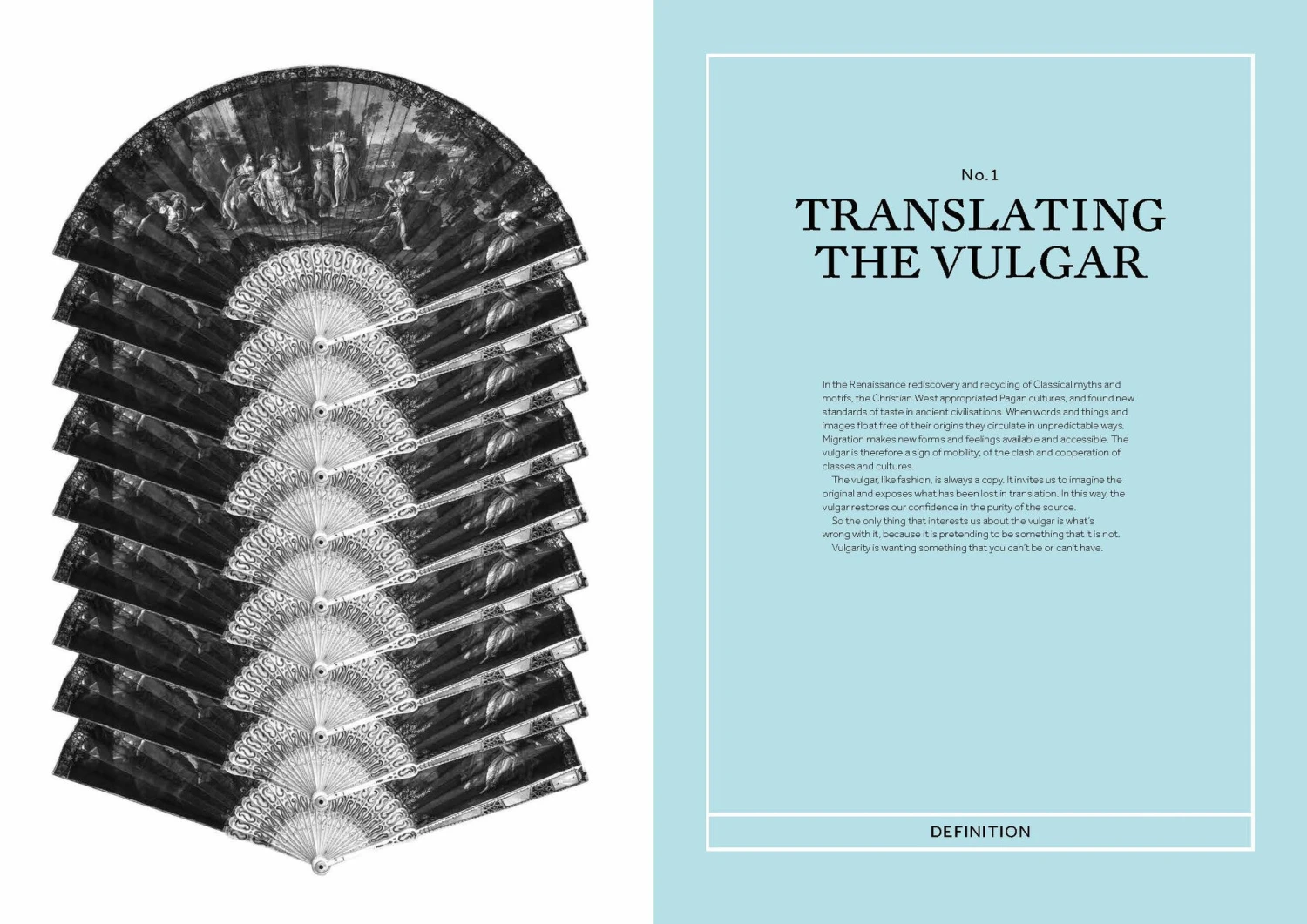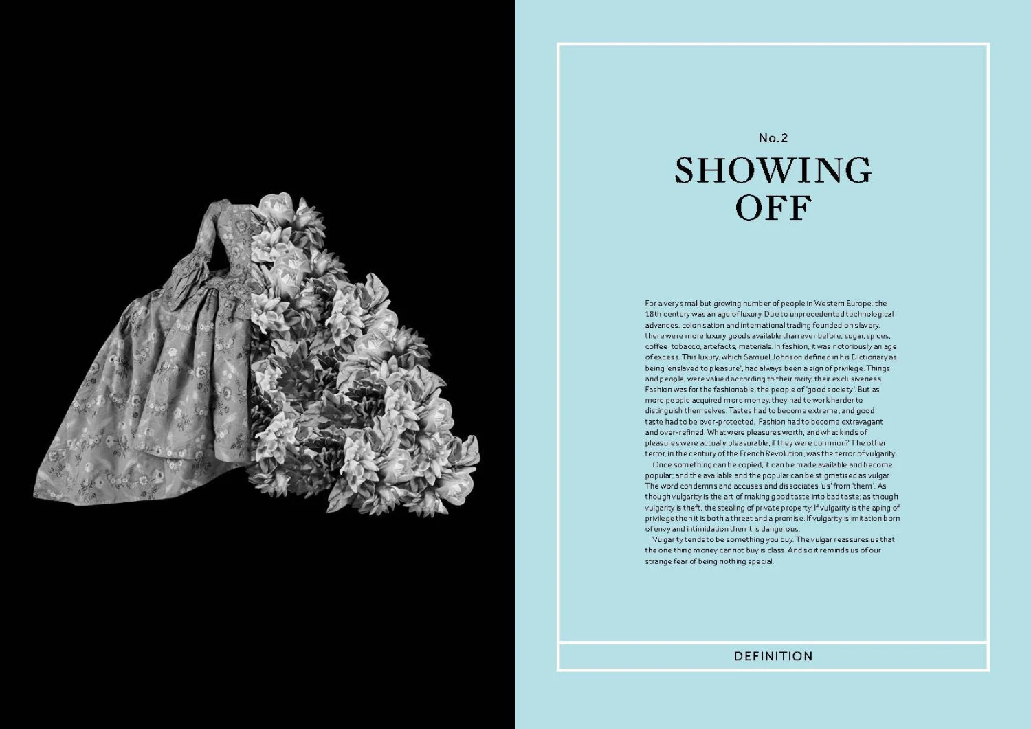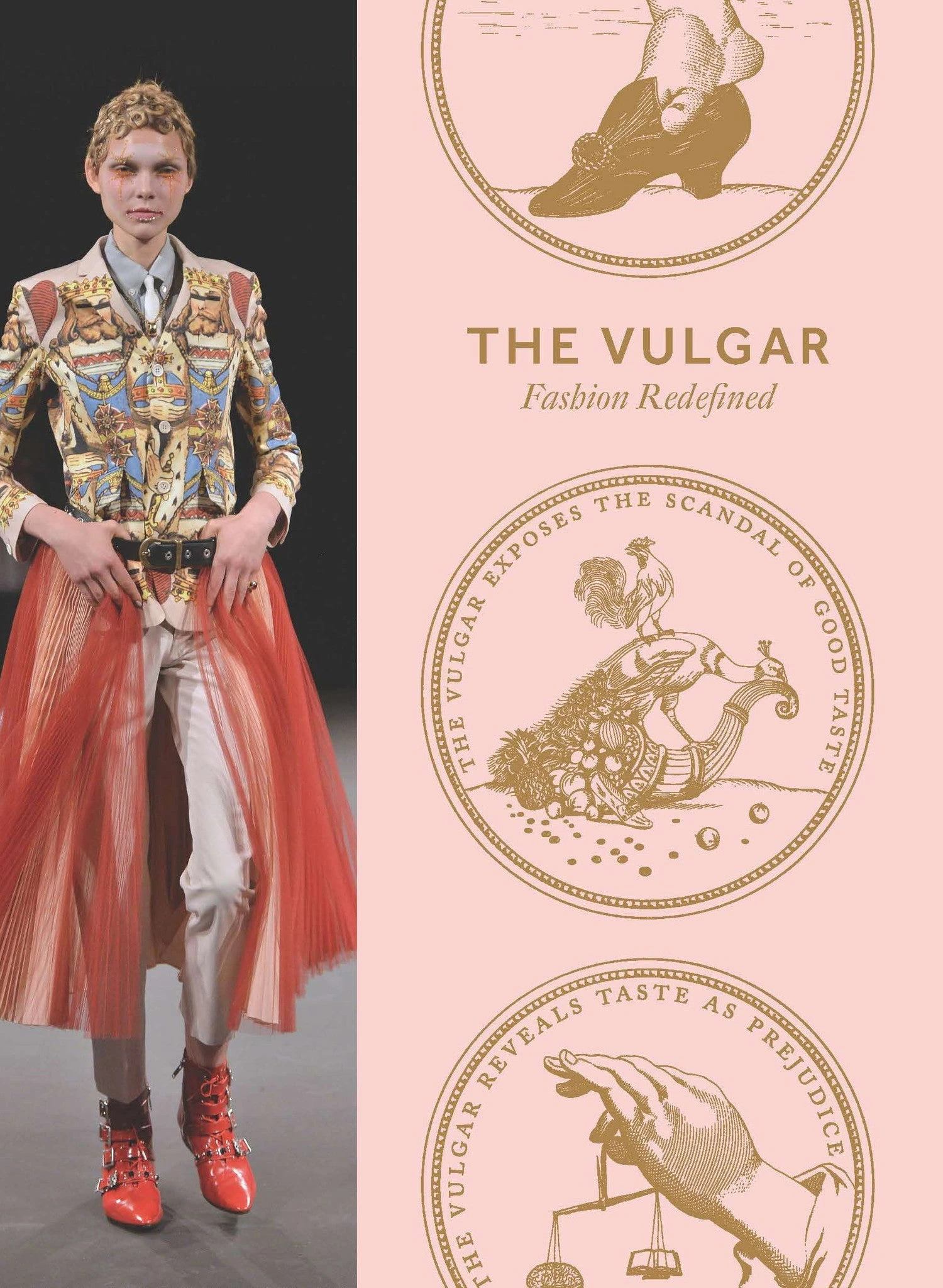 The book includes dictionary definitions and literary quotes of the word vulgar alongside transcripts of interviews with leading contemporary designers including Walter Van Beirendonck, Manolo Blahnik, Hussein Chalayan, Pam Hogg, Stephen Jones, Christian Lacroix and Zandra Rhodes.