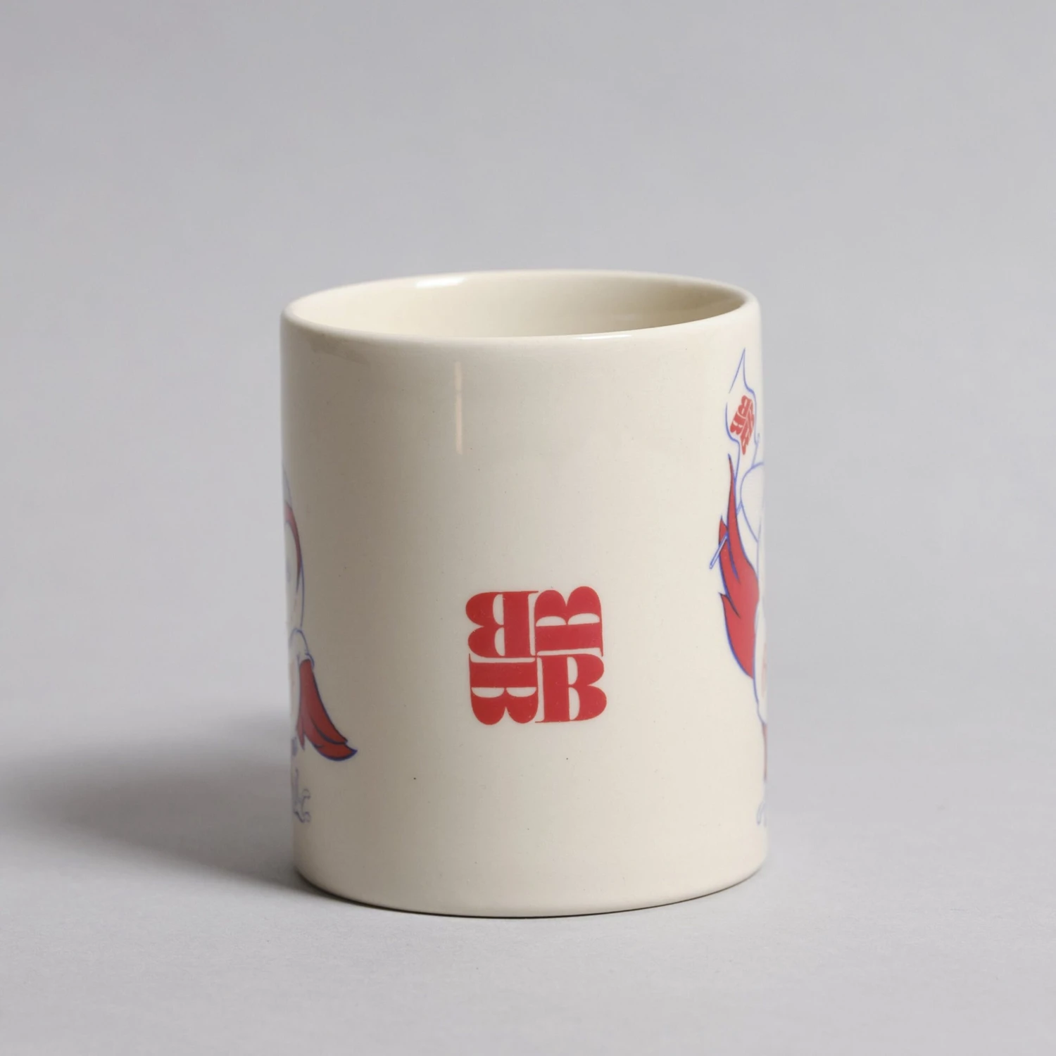 The mug is a piece of vintage Barbican design, featuring the old Barbican logo (and our old telephone number on the bottom!) and ‘Barney the Barn Owl’ himself.